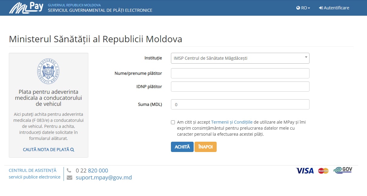 Examinarea medicală а conducătorilor de vehicule și а candidaților pentru obținerea permisului de conducere se efectuează contra plată, prin serviciile https://mpay.gov.md/Services/Service/CNS01